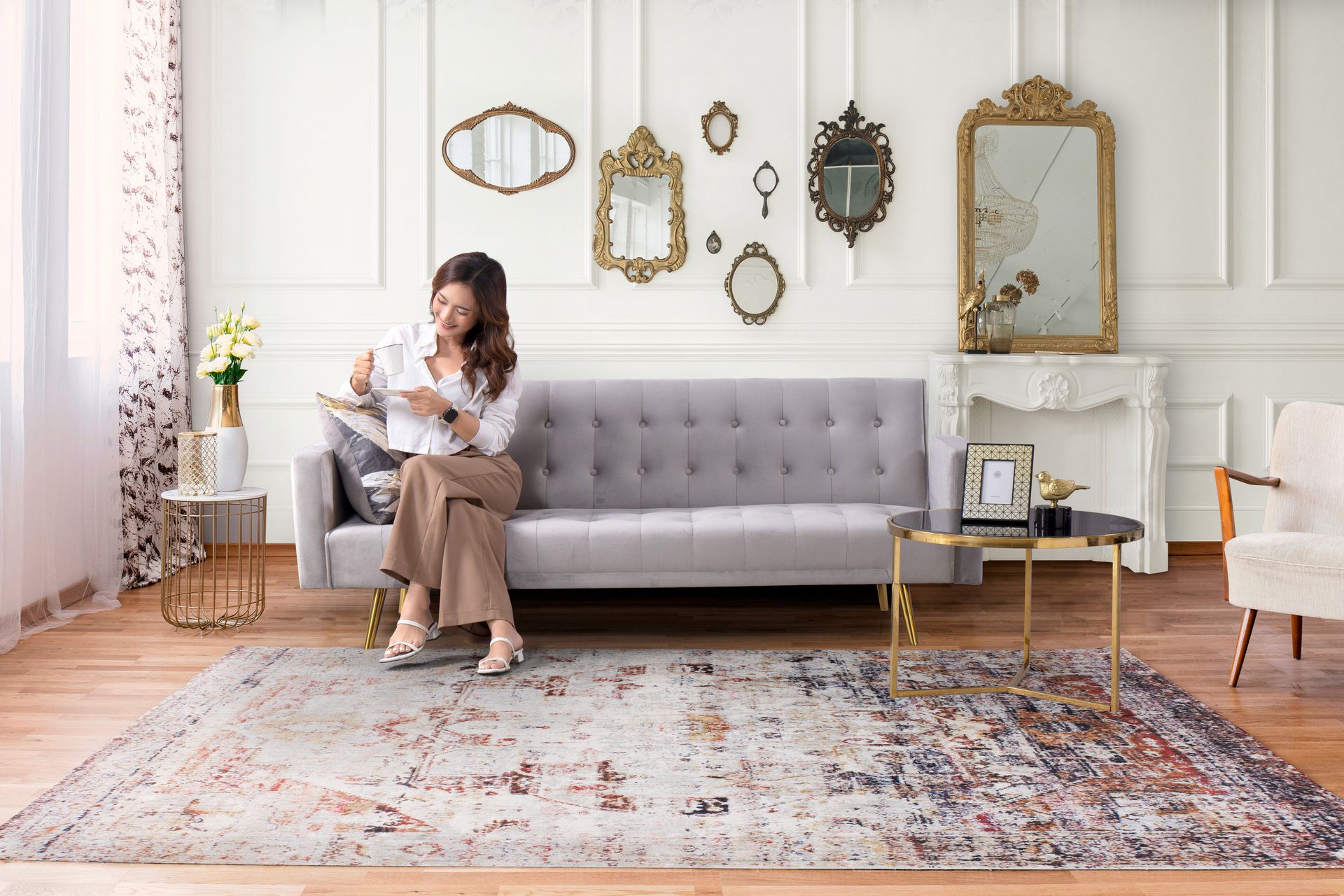 • Color Palette: The beautiful grey velvet fabric enhances the sofa's aesthetic appeal, evoking a sense of luxury and opulence. The chosen hue blends perfectly with the Vintage theme, adding a nostalgic and inviting ambience to any living space.